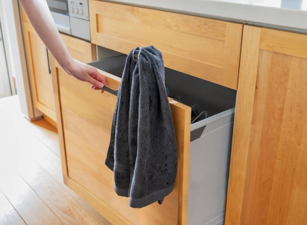引出しと連動して動く構造でタオルの巻き込みを防ぎ、腰をかがめずにサッと手を拭けます。