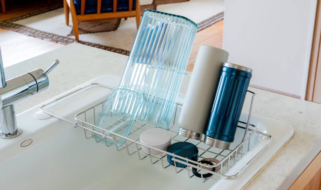 水筒もお皿も立て掛けてすっきり乾かせる、省スペースの水切りかご。