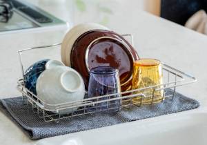 水筒もお皿も立て掛けてすっきり乾かせる、省スペースの水切りかご。