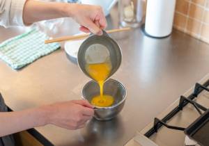 濾してそのまま注げる ざるで卵を濾せば、なめらかな仕上がりに。